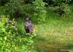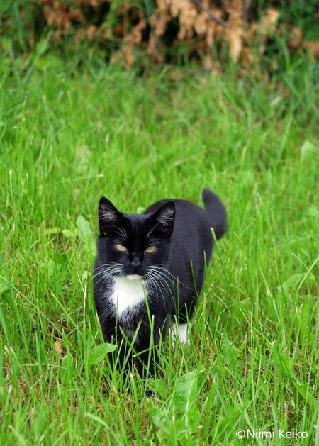 湖近くの草地を散歩していた猫です。このあと霧雨が降りはじめましたが、慣れた様子でそのまま散歩を続けていました。