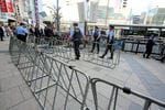 指揮棒を持った警察のお偉いさんが部下に何か囁く。