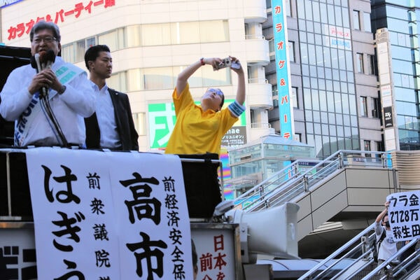 しばらくすると、さっきの裏金問題を訴えていた男性の前には萩生田氏の運動員が駆け付け、ノボリで周囲からは見えないように囲ってしまった。男性による暴力行為やテロ行為があったわけではないので警察のほうで排除することは控え、男性の姿がほかの聴衆の目につかないよう、運動員がノボリで目隠ししたということなのだろう。
