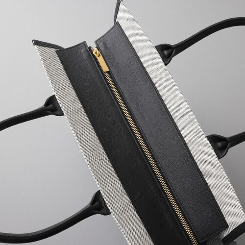 このトートは色や形を長もちさせる目的で、フランスとイタリアにて厳密な基準を設けて織り上げた特注キャンバスを使用する。白糸と紺糸の2色織りゆえの上品さと爽やかさを備えたルックスも特徴。キャンバスらしいナチュラルなタッチがありながら、防水や撥水、それに防汚性をもたせるため特殊樹脂を両面コートしており、日々の手入れもじつに容易。また、ハンドルやキワ部分をレザーに替えているため、実用的かつクラス感ある仕上がりとなっている。