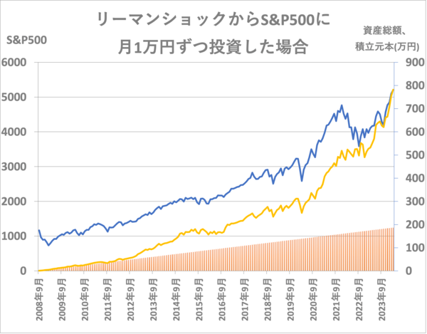 2008年9月から2024年3月まで、S&P500に毎月1万円ずつ積立投資していたら、資産は次のようになります。
