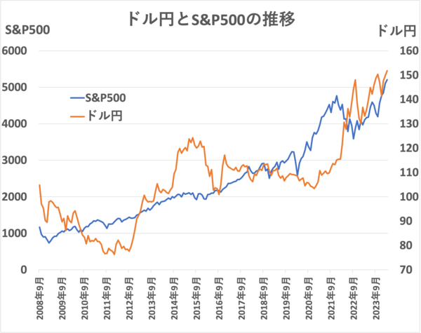 青いグラフのS&P500は約16年かけて右肩上がりで成長しています。オレンジのグラフのドル円は上下に激しく変動しながら、直近は1ドル151円となっています。ドル円は70円台と超円高になっている時期もありますし、70円台から見たら2014年11月〜2016年1月は大幅に円安水準の120円台の円安局面を迎えている時期もあります。