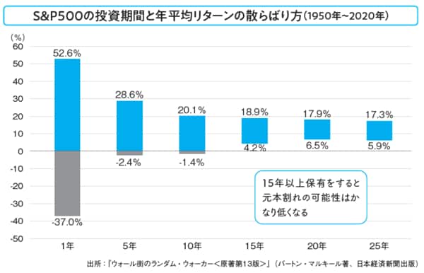「ウォール街のランダム・ウォーカー」(バートン・マルキール著/日本経済新聞)という、投資の名著があります。ここでは、15年以上保有することで元本割れしないという分析結果が紹介されています。