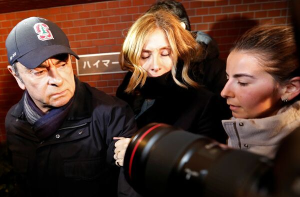 保釈中、都内に姿を見せたゴーン氏。隣はキャロル夫人(写真:ロイター/アフロ)