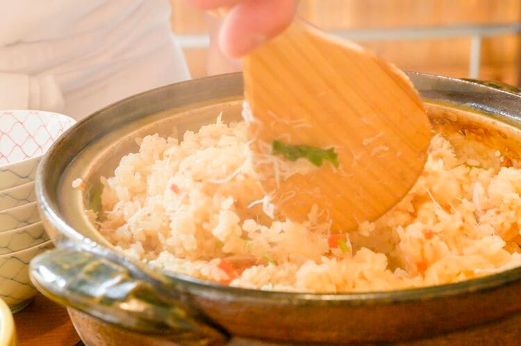 日本食らしいシンプルなデザートの前にコースを締めるのが土鍋ご飯。このときはカニをふんだんに使ったものを目の前で用意してくれた