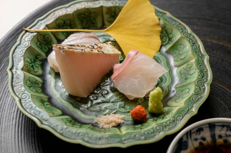 造り写真は皮を軽く焼いたサワラとイシガキダイの刺し身を柚子胡椒、わさび、塩で。唐津漁港の名うての仲卸から仕入れており、豊洲への依存度は1割程度とのこと