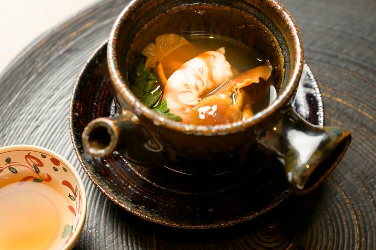 アワビの小鍋の前に出された大分のなめことエビの土瓶蒸し。本来、強烈な旨味を感じてしかるべき料理だとおもうけれど、抑制の効いた繊細でエレガントな味わいを実現している