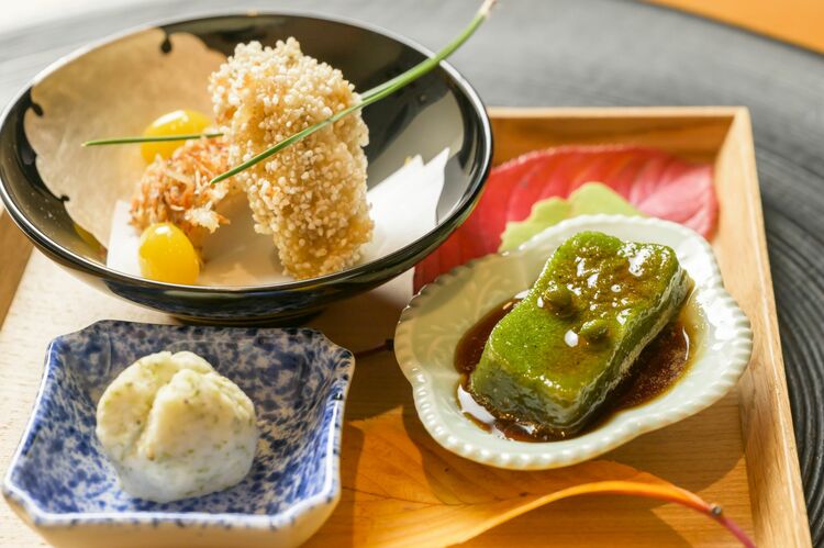 写真右の皿が「よもぎの山椒煮」。左上は秋月の里芋をちりめんじゃこを使って揚げたものと、九十九島の牡蠣を真挽粉で揚げた揚げ物。左下は馬鈴薯をチーズとともに餡状にしたもの