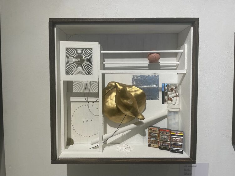 キュレーションは、ギャラリーオーナーでアーティストの岡本光博。自身の作品は、日韓朝問題を象徴するオブジェが詰めあわされたボックスアートだ。