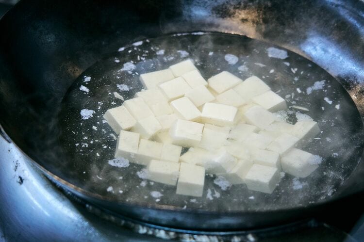 2. 鍋に湯を沸かし、塩ひとつまみ(分量外)を加えて水を切った豆腐を茹でる。