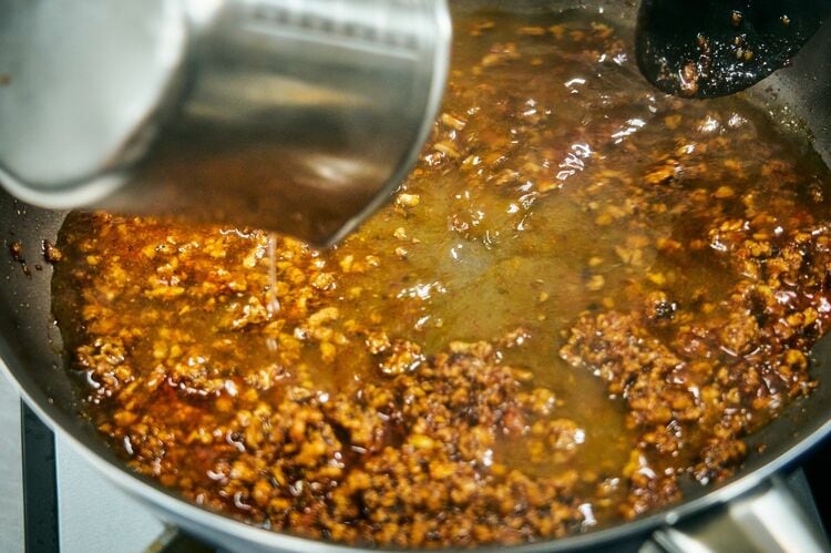 ここでの目的は単に火を通すのではなく、後の調味料がしっかり入るよう、豚ひき肉の水分を十分に飛ばすこと