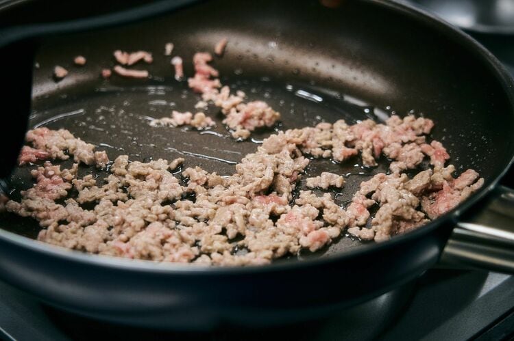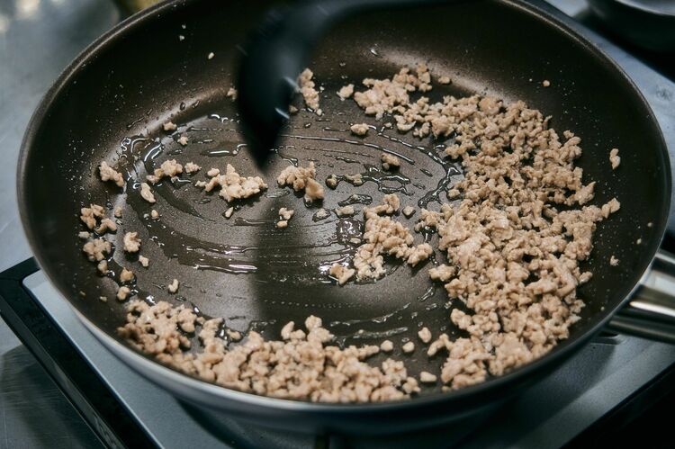 すでに豚ひき肉に火が入っているが、フライパンの表面には水分が出ている状態
