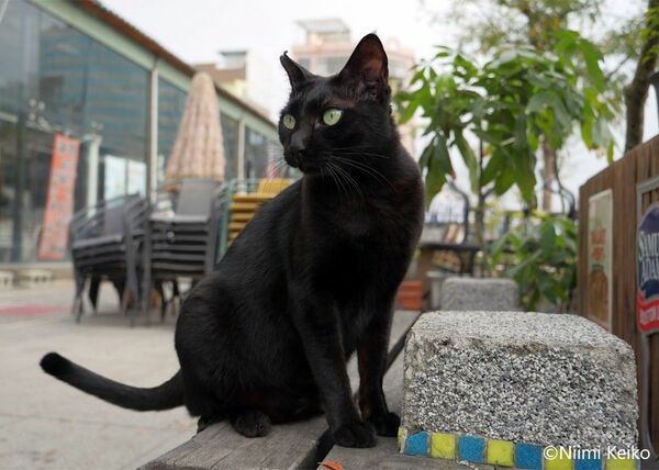 夜はずっとにぎわっていた繁華街も、翌朝にはすっかり静かになっていました。広い歩道にいたこの黒猫は、前の晩にバーで出会っています。夜明けまで店にいたのでしょうか。朝の静けさが好きだな、と体を休めている様子でした。