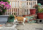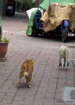 飲食店と市場、催事場がいっしょになった商業施設です。朝早く猫が閑散とした広場を眺めていました。犬を散歩させる人が近くを通ると、そちらに目を向けました。