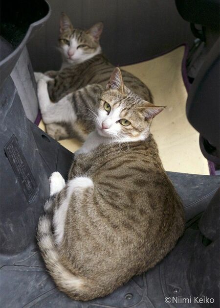 2匹はいっしょに生まれたきょうだい。母猫とはぐれたのか、2匹の子猫がある日突然やってきて、このバイクの上で寝ていたので、工場で子猫たちの面倒を見ることにしました。工場の中に入りなさいといっても、入るのはごはんと暴風雨のときくらいで、いつもバイクの上にいるのだそうです。