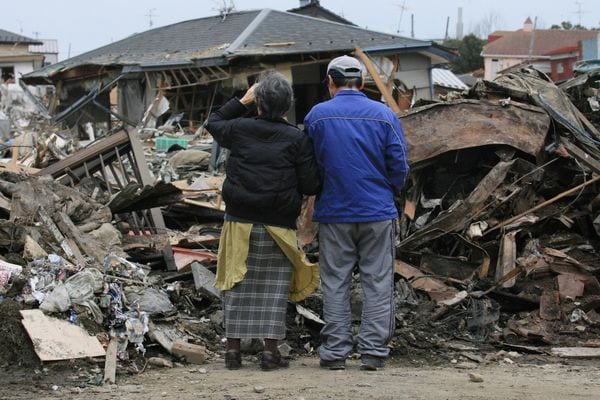 【東日本大震災】津波に流された自宅前で悲嘆にくれる老夫婦(写真:橋本 昇)