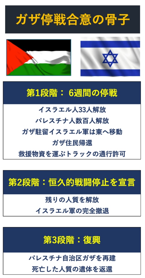 互いの人質解放と並行し、イスラエル軍はガザ市街地を離れ、避難しているガザ住民が帰還できるようにします。ガザに1日600台のトラックを入らせ、救援物資を運べるようにすることにも合意しました。