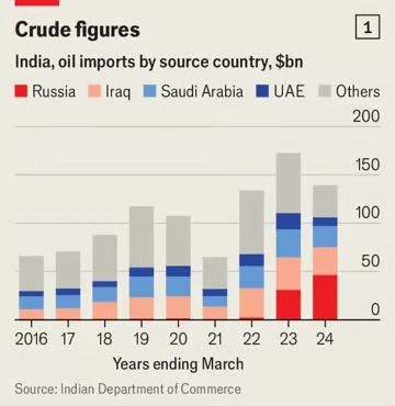 2021年にはインドが輸入する石油のうちロシア産は2%を占めるにすぎなかったが、2024年4~10月期ではその割合が40%近くに上る。