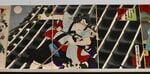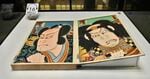 「豊原国周生誕190年 歌舞伎を描く―秘蔵の浮世絵初公開!」展示風景。 左から、三代歌川豊国(国貞)《四世中村歌右衛門の熊谷直実》万延1年(1860)9月、三代歌川豊国(国貞)《三世中村歌右衛門の五斗兵衛盛次》文久3年(1863)7月 ともに前期展示