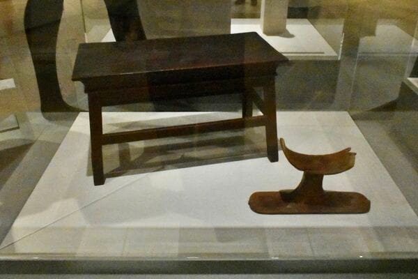 「ブルックリン博物館所蔵 特別展 古代エジプト」展示風景。 左から《木製のローテーブル》前1539〜前1292年頃、《守護の神々が彫られている木製の枕》前1479〜前1400年頃 ともにブルックリン博物館蔵