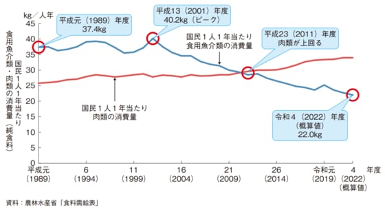 農林水産省食糧需給表によれば、日本人の1人当たり年間食用魚介類消費量(純食料)は、2001年度の40.2㎏をピークに減少傾向で、2022年度は22.0㎏と半分近くまで落ち込んでしまった。この値は調査を始めた1960年以降で最低だった。一方で、肉類の消費量は増加傾向で、2011年には消費量が魚介類を上回り、2022年度は33.5kgとなり、魚介類消費量との差が年々広がっている(図1)。