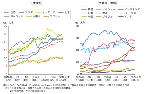 図2:世界の1人当たりの食用魚介類の消費量の推移(令和5年度水産白書より引用)。世界各国魚介類の消費量が増加傾向にあるのに対し、日本だけが減少している。