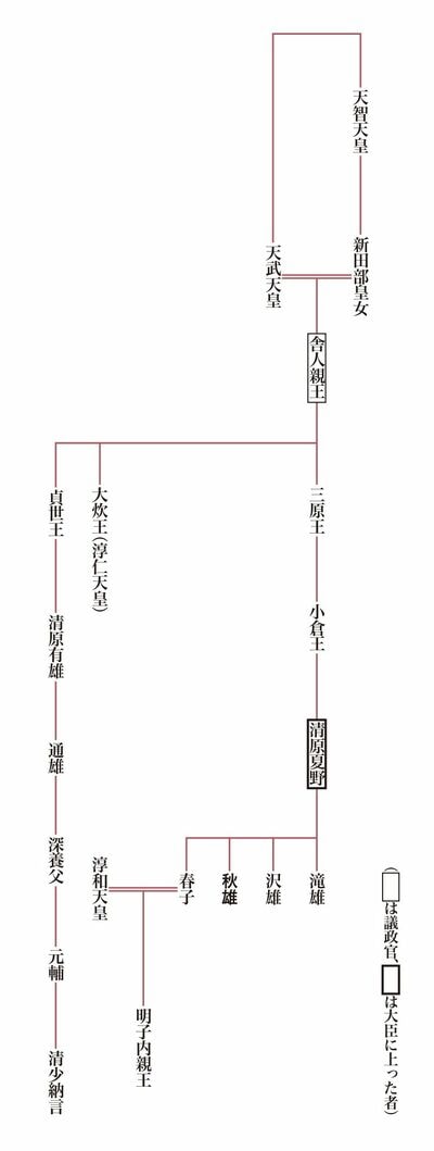 清原氏については、先に岑成(みねなり)の項で述べた。天武(てんむ)皇子の舎人(とねり)親王を祖とする皇親氏族でありながら、この頃には中級官人を出す氏族に没落し、やがて学者や歌人を輩出する氏族となった。夏野が右大臣に任じられたのはまったくの例外で、夏野の子供たちも中級官人としてさまざまな官を歴任している。
