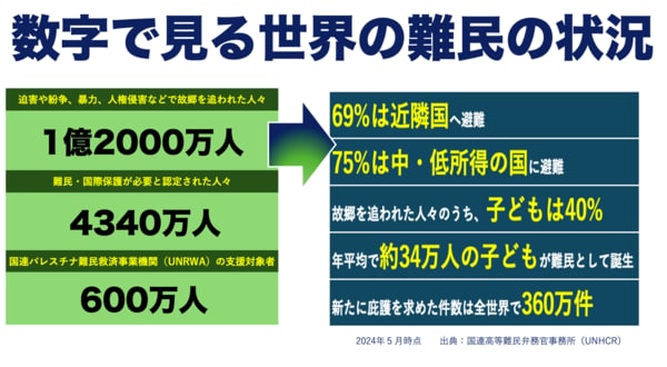 国連難民高等弁務官事務所(Office of the United Nations High Commissioner for Refugees=UNHCR)の資料によると、2024年5月現在、迫害や紛争、暴力、人権侵害、気候変動などによって故郷を追われた人は、世界で実に約1億2000万人に達しました。日本の総人口に匹敵する規模です。