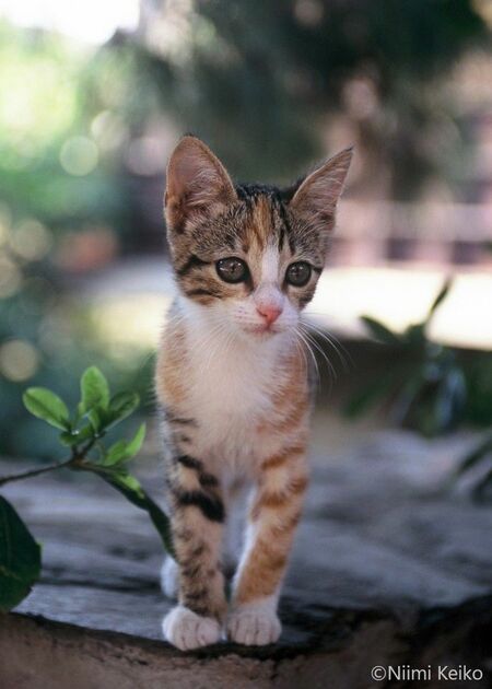 子猫が何匹かいたのですが、このチャーミングな三毛は、大きな目を輝かせて、木陰で瞬くように動く小さな木漏れ日を、興味深そうに見つめていました。
