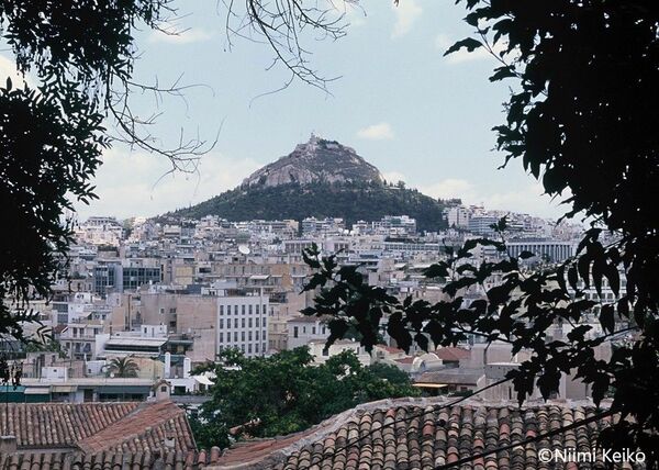 アクロポリスの丘から北東の方向に見えるリカヴィトスの丘(標高277m)です。アテネで最も標高の高い場所で、アテネ市街地の至るところから、この丘とパルテノン神殿の立つアクロポリスの丘が目に入ります。