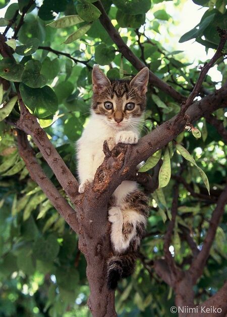 こちらの子猫は初めて木登りに挑戦したようです。気がつくと眼下に見たことのない景色が広がっていて、びっくりしたのでしょう。目をまんまるくしたままじっとしていました。