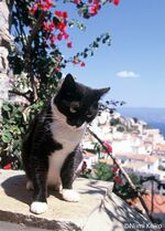 港の前にある宝飾店から猫が出てきたかと思うと、少し怖い顔になって道のまんなかで座りました。島猫(地域猫)が店の近くにマーキングしないよう見張っているようでした。