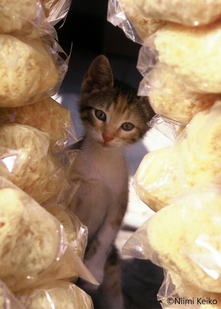海綿(スポンジ)など島の特産物を扱う店で飼われるようになった島猫の子猫。同じくらいの大きさの子猫が近づくと、スポンジの陰に隠れつつも体を大きく見せていました。