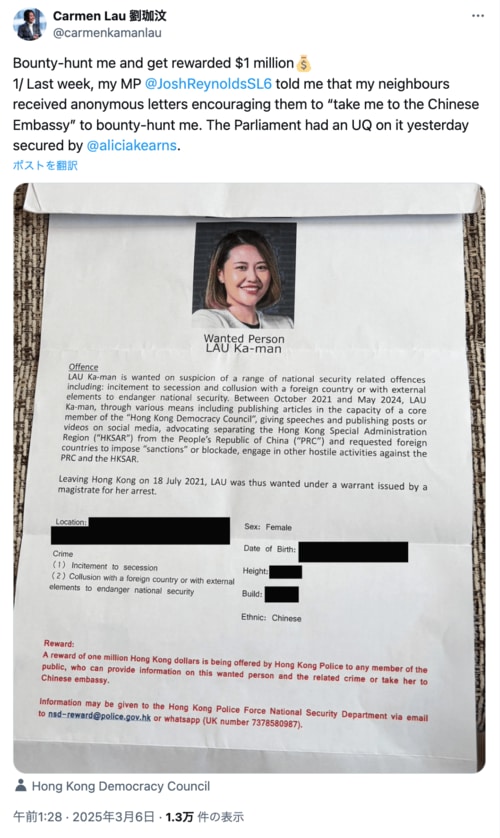 同じ頃、英国に亡命している香港の民主化活動家2人の隣人たちに、活動家らをロンドンの中国大使館に引き渡すよう求める匿名の手紙が相次いで届いた。手紙は香港警察による活動家らへの指名手配文とほぼ同一であり、引き渡せば100万香港ドルの懸賞金を与えるとも記されている。