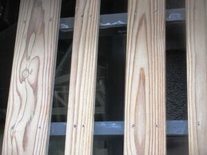 建物の外部は、フレームに木材がネジ止めされているのですが、この写真をよく見てください。木の年輪のような模様が、くっきりと浮かび上がっているのが分かると思います。