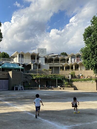 南側の園庭から見る。園舎に見守られているようだ