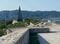 管理棟の屋上から記念塔に向けて石垣に囲まれた屋上が続く