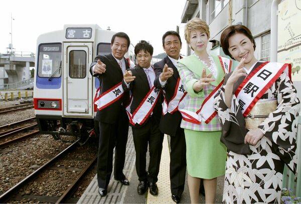 「頑張ろう三鉄の集い」で三陸鉄道宮古駅の一日駅長となり、ポーズをとる杉良太郎さん、清水宏保さん、山本譲二さん、瀬川瑛子さん、伍代夏子さん(2011年6月、写真:共同通信社)