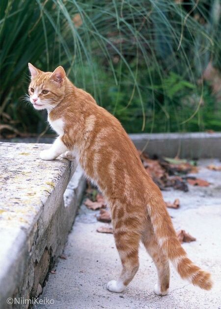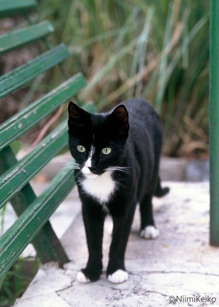 黒白猫も派手な柄の猫に気がついて、足を止め、見つめました。あまり親しい感じでもないけど、仲が悪いようにも見えませんでした。