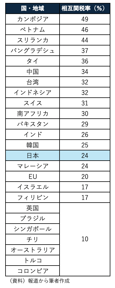 既報の通り、日本への相互関税は24%と設定されている(図表①)。この前提として、トランプ政権は非関税障壁などを含めると日本は米国に対して実質46%の関税を課している状態にあると認定し、46%の約半分に相当する24%の追加関税を適用すると主張している。