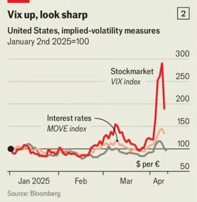 トレーダーが相場の激変から身を守るために支払う保険料から導かれるボラティリティー(変動性)の指標は、トランプ氏の発表を受けて多少低下したとはいえ、以前からは急上昇した形になっている(図2参照)。