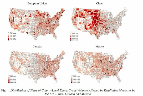 トランプの第1期政権における関税政策と、それに対する報復関税を検証したThiemo Fetzer and Carlo Schwarz(2021)の論文では、驚くことにEUや中国はトランプ支持者が多いアメリカの郡が、他の郡よりも打撃を受けるような報復関税を仕掛けていたことが示されている。
