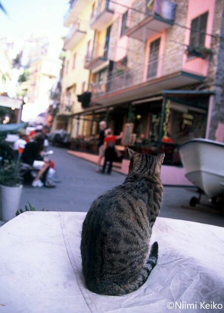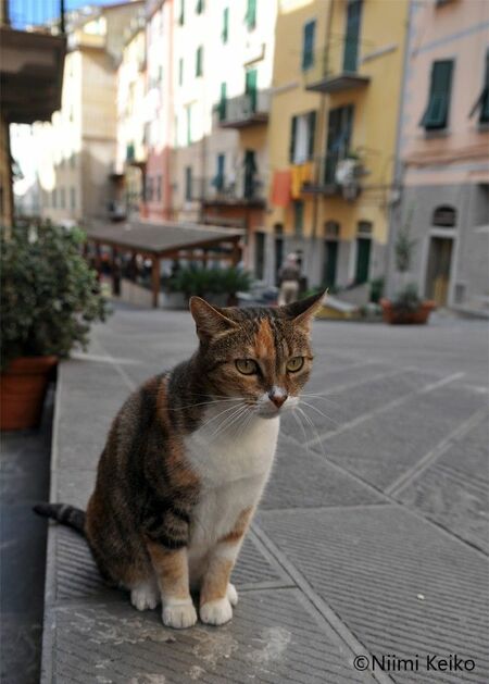 こちらは、マナローナの隣町リオマッジョーレです。小さな港から続く目抜き通りに、朝日が射すのと同時に猫が現れました。この場所で、観光案内所の所長を出迎えるのが日課となっています。