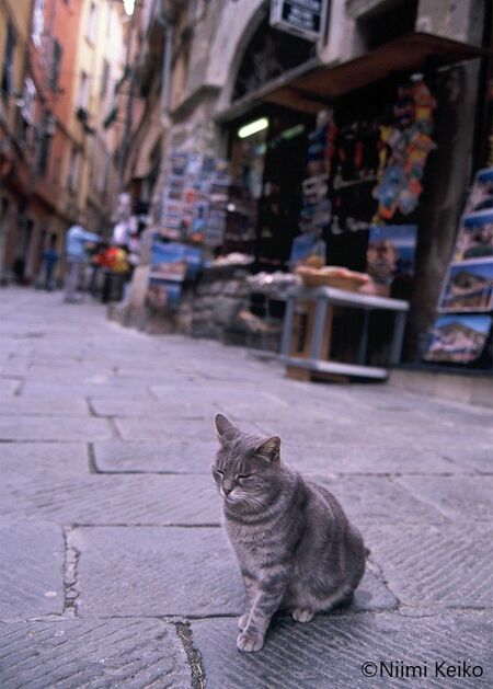 天気を気にするように、土産物屋の猫が風の音に耳を傾けていました。今日はまだお客さんが一人も来ないないなぁと、天候の回復を祈っているようです。