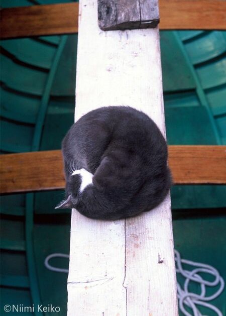 小さな港の岸壁に上げられた小船の中で、猫が丸くなって寝ています。気温が下がるにつれてさらにまん丸に近づいていきました。