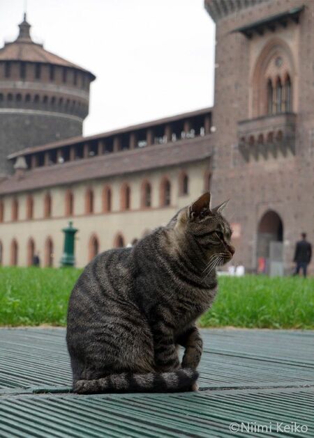 まず訪れたのは、北部にある都市ミラノ。センピオーネ公園からスフォルツェスコ城へと入っていくと、ちらほらと猫の姿がありました。最初に見た猫は、ある1点を見つめ、前足を左右交互に浮かせていました。