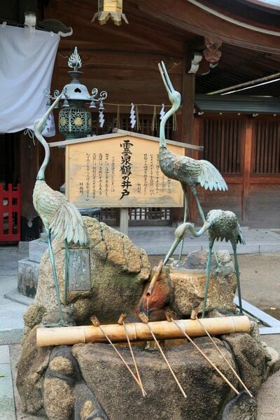 拝殿の右側にある霊泉鶴の井戸も見逃せない。本殿の真下から湧き出す水で、自分、家族、親類縁者の不老長寿を念じながら飲むとご利益があるとされている。しかし残念ながら、現在は飲用が禁止されている。この水には塩分が含まれており、以前飲んだ人によれば、かなり塩辛かったそうだ。