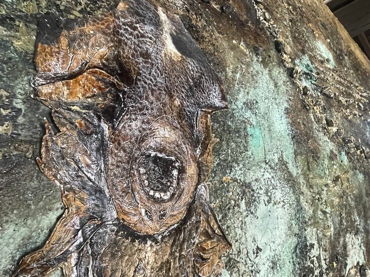 また、キーファー自身も、元離宮二条城で金碧障壁にインスパイアされて、金を多用した出品作を制作し、場所へのオマージュとした。現代の巨匠の作品の輝きを通して、狩野派伝統の豪壮な美を再発見する観客もいるだろう。作品を、建物の陰影や自然光の中で鑑賞できるのも貴重な体験だ。照明設備を設営できない、という場所のハンディをメリットに転じた。