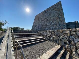 小さな分棟の建物群(それぞれが小パビリオン)で、蛇篭の円筒に木の葉のような屋根が載っている。かわいい。「蛇篭(じゃかご)」というのは金属で編んだ籠に砕石を詰めたもの。本来は河川の護岸や斜面の補強などに使用される。建築のランドスケープにも使われるが、建物本体に使うのは珍しい。これだけでも構造としてもちそうだが、概要データを見ると構造形式は鉄骨造として設計したようだ。