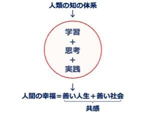 赤い丸枠内にあるように、人類の知の体系を「学習→思考→実践」という順番で自らの中に取り入れ、それを身体知化していくプロセスが教養だというのが私の理解です。